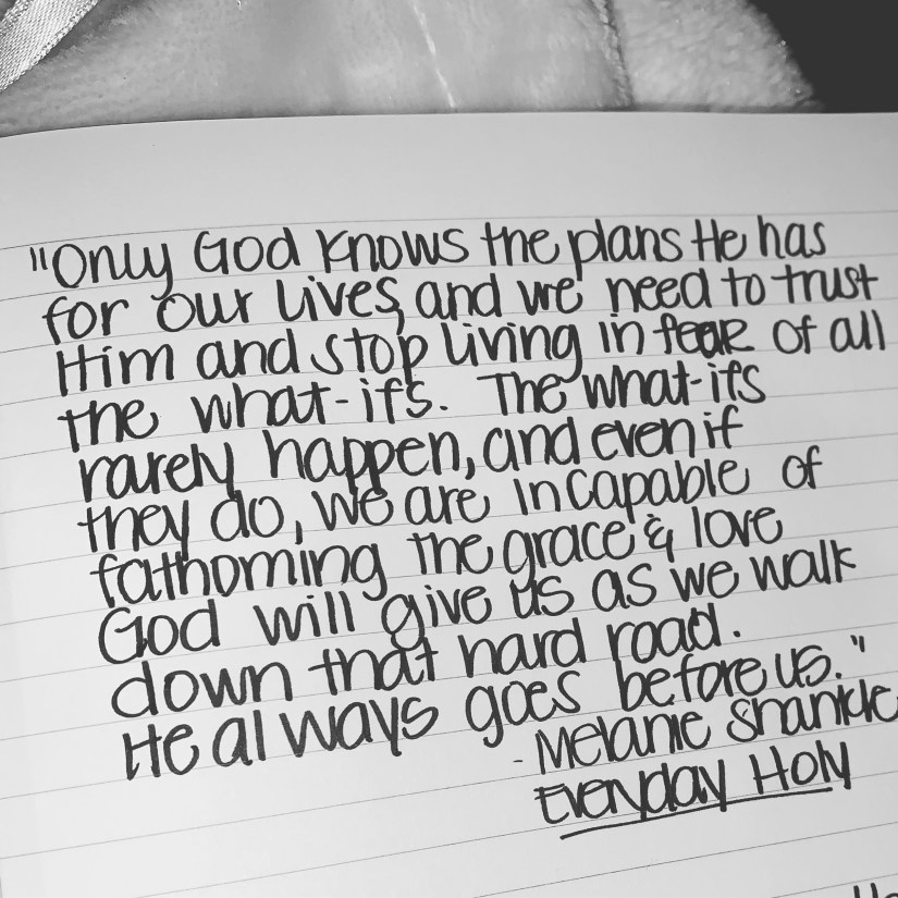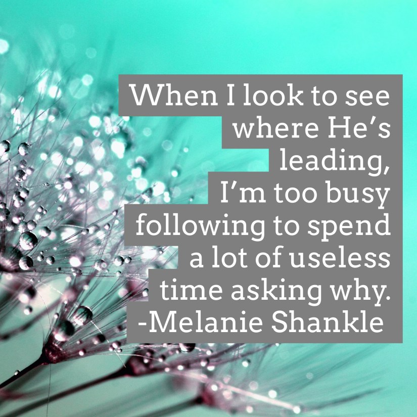 I was reading Everyday Holy by Melanie Shankle, and she talks about the need to stop asking God why things are happening and instead asking Him where we are going. But it’s so much easier to ask why.