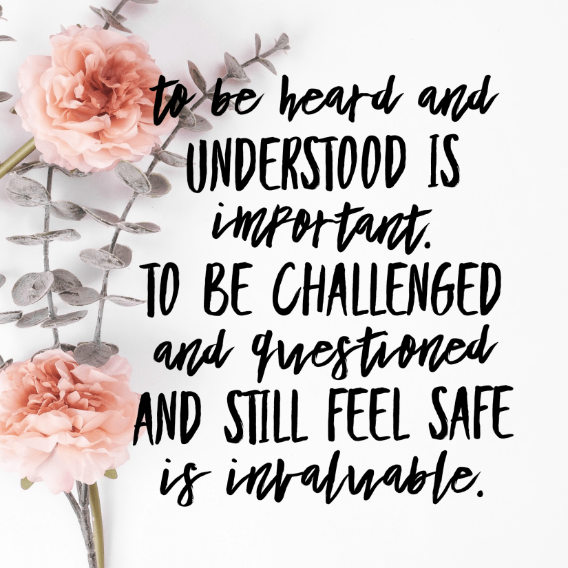 And when we finished with that situation and dove headfirst into what I could improve upon and where she felt hurt in another situation, it felt safe. And when I heard “this is where you need to work” I heard it as let me help you along this journey because I love you and I want you in my life instead of the usual you’re screwing up again and I’d like to rub your nose in it. It came from a place of love. And because we do mutually love and respect each other and value this friendship to its core, I left the discussion so glad that it had been had.