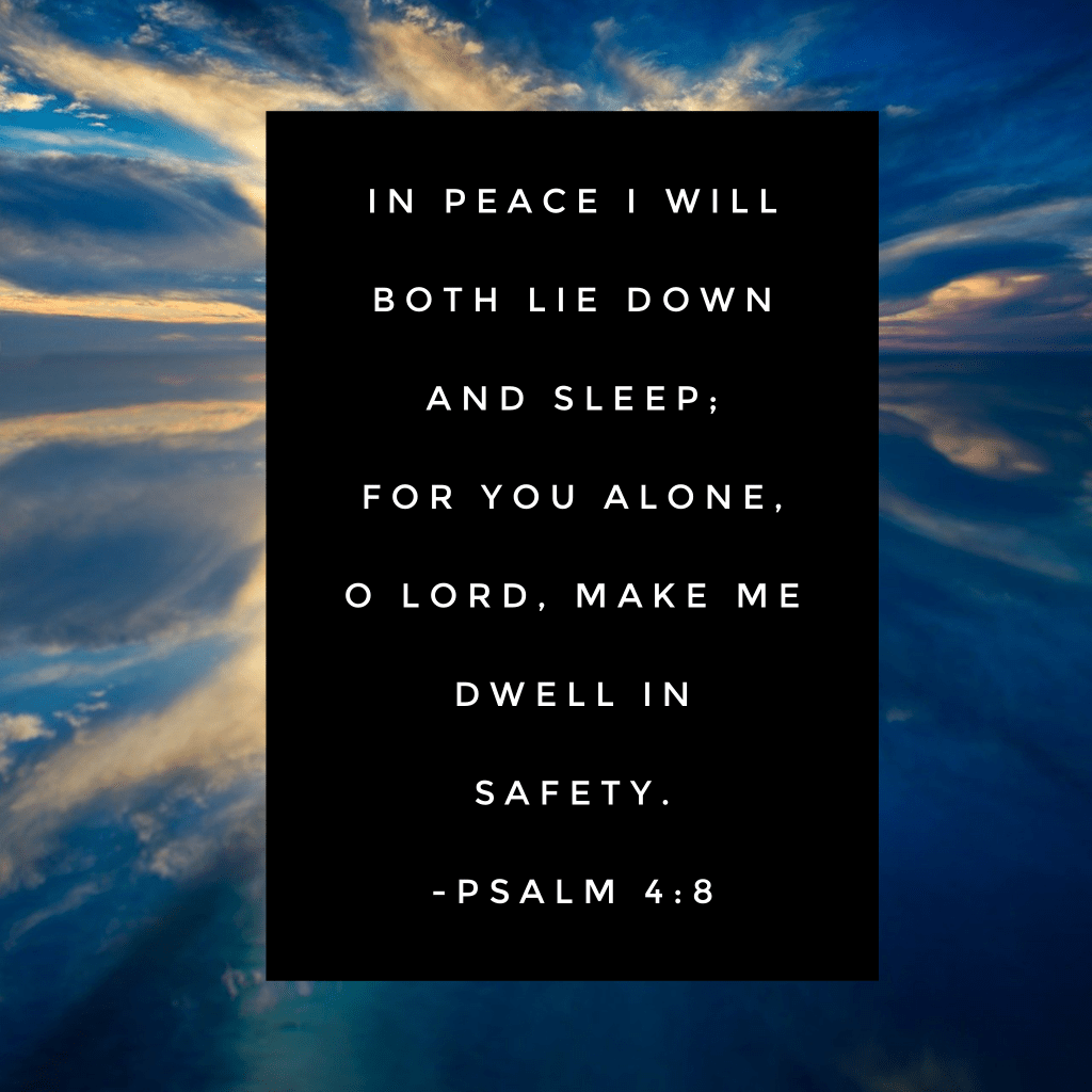 But this verse says in peace I will both lie down and sleep. Not just lie down and wait. We’ve probably all had those times, or maybe it’s just my lifelong fear of something bad. I know I’ve laid down and not slept because I’m just waiting. Waiting for something bad or building up something bad in my own mind.